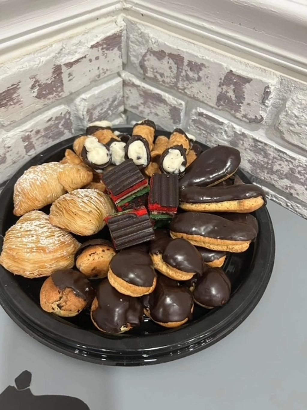 Small Pastry Platter: Assortment of 9 mini cream puffs filled with pastry cream; 3 mini sfogliatelle, 6 mini eclair filled with pastry cream, 6 mini rainbow cookies, and 9 mini cannolis.