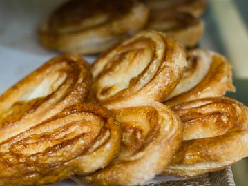 A classic French pastry also known as palmiers or palm hearts made with puff dough and sugar folded to create layers and baked until golden and caramelized