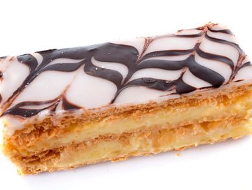 A French dessert featuring multiple layers of flaky puff pastry stacked with a rich pastry cream topped with a marbled white and chocolate glaze