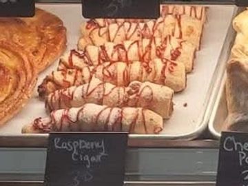 Delicious raspberry, yellow cake, cinnamon sugar rolled into a piece of puff pastry and topped with dusting sugar and our European Raspberry