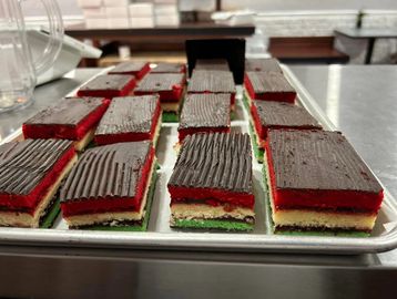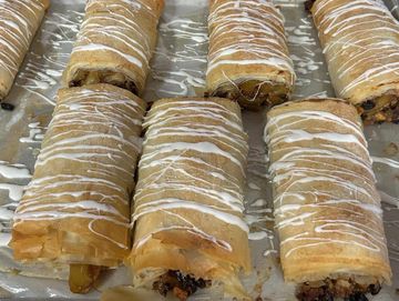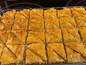Rich layers of phyllo dough filled with either chopped walnuts and spices and sweetened with our special honey syrup or chopped pecans, orange zest and spices and topped with our hone syrup with a touch of bourbon