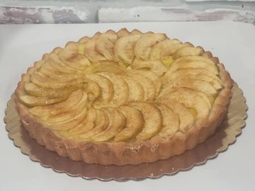 An Italian pastry originating from the Puglia region. This baked short crust pastry is filled and baked with our pastry cream and topped with Granny Smith apples, butter and cinnamon sugar or a short crust and coarse sugar. Large and single serve options available