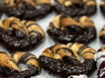 Pastry filled with our own chocolate or cinnamon smear baked to a golden brown and topped with coarse sugar or almonds and dipped in chocolate
