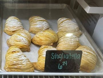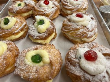 AKA zeppoli di San Giuseppe is a traditional Italian pastry, usually made for the Feast of St. Joseph on March 19th, but made daily here at DeLucia's. It is a light and airy fried dough filled with rich cannoli or pastry cream, garnished with powdered sugar and a cherry