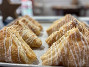 Flakey pastry filled with our homemade apple mixture and topped with a little coarse sugar crunch and drizzled with white icing. Ask for other fruit variations (cherry, raspberry, peach, blueberry)